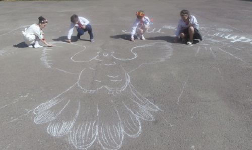 «Мирну Україну» намалювали учні на шкільному подвір’ї, перекресливши своїми творіннями вибухи, постріли, війну.