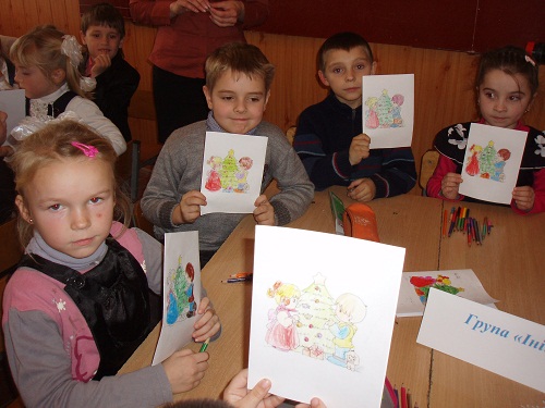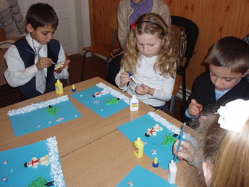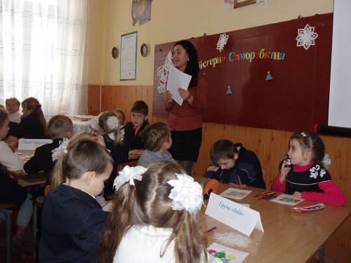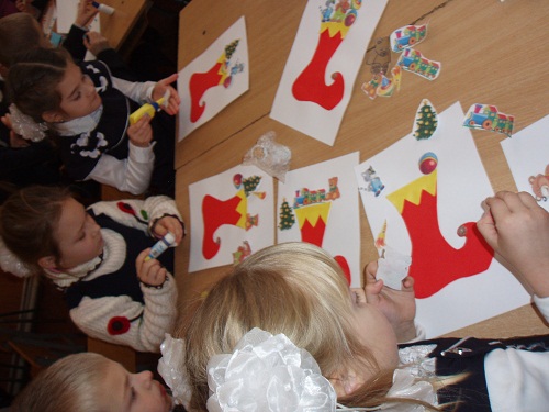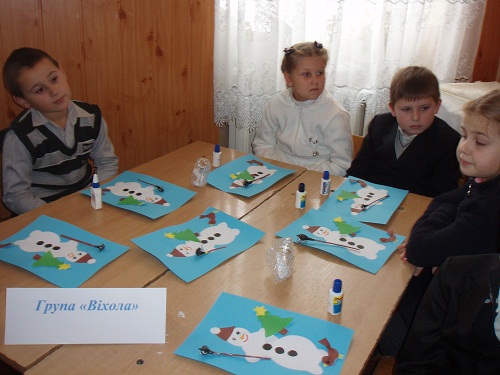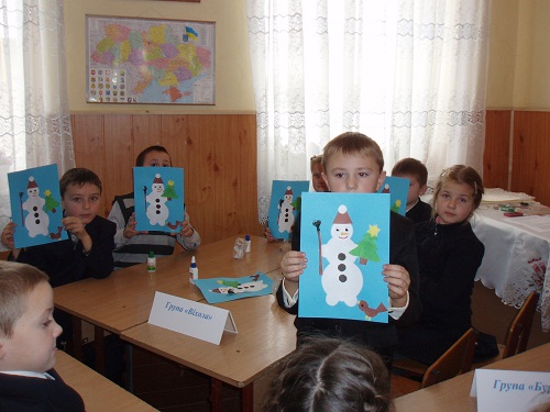 Учні працювали в групах, отримавши кожен своє завдання. Цікаво було спостерігати, як в дитячих руках поступово народжуються новорічні сувеніри: листівки із сніговичками, чобітками, сніговими розмальовками тощо.