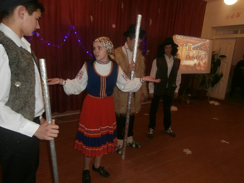 Цікаве театралізоване вертепне дійство підготували учні 10 класу. Воно ніби перенесло школярів, батьків, учителів та всіх присутніх у часи царя Ірода, коли народився маленький Ісус. Як завжди у вертепі протистояли дві сторони: світла ( Ангел, пастухи, царі, дівчина) та темна ( жид, жидівка, чорт, Ірод). Звичайно, світлі сили перемогли. Ангел сповістив про народження Христа, усі співали колядки, у яких прославляли новонароджене дитя.