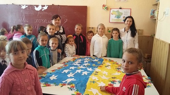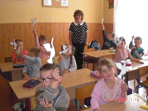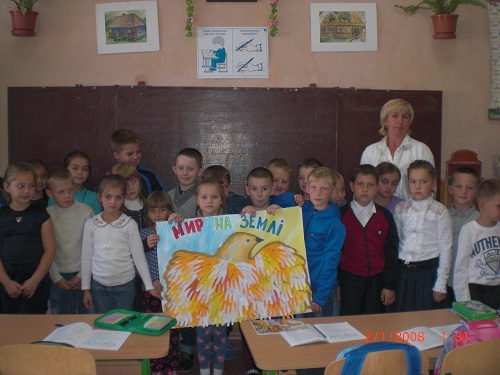 Учні 2 та 4 класу створили чудову карту України, оздоблену маками та волошками, прикрасивши її паперовими голубами – символом миру. Свої побажання жити в мирній державі написали на кольорових «долоньках» третьокласники, а наймолодші школярі, учні 1 класу, виготовивши білих голубів, усі разом заспівали пісню про мир.